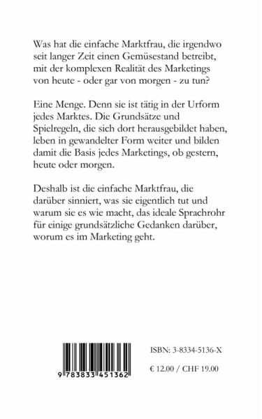 Was hat die einfache Marktfrau, die irgendwo seit langer Zeit einen Gemüsestand betreibt, mit der komplexen Realität des Marketings von heute - oder gar von morgen - zu tun? Eine Menge. Denn sie ist tätig in der Urform jedes Marktes. Die Grundsätze und Spielregeln, die sich dort herausgebildet haben, leben in gewandelter Form weiter und bilden damit die Basis jedes Marketings, ob gestern, heute oder morgen. Deshalb ist die einfache Marktfrau, die darüber sinniert, was sie eigentlich tut und warum sie es wie macht, das ideale Sprachrohr für einige grundsätzliche Gedanken darüber, worum es im Marketing geht. In zwölf kurzen Essays mit jeweils einem Schmuckbild werden grundlegende Überlegungen zur Marketing-Philosophie und damit zur Zukunft des Marketings angestellt. Marketingphilosophie und die Zukunft des Marketings sind zentrale Themen der Bewusstseins-Elite im Marketing: www.bewusstseins-elite.net Andreas Giger, Jahrgang 1951, lebt und arbeitet als freier Zukunfts-Philosoph, Autor und Photograph im schweizerischen Appenzellerland: www.gigerheimat.ch