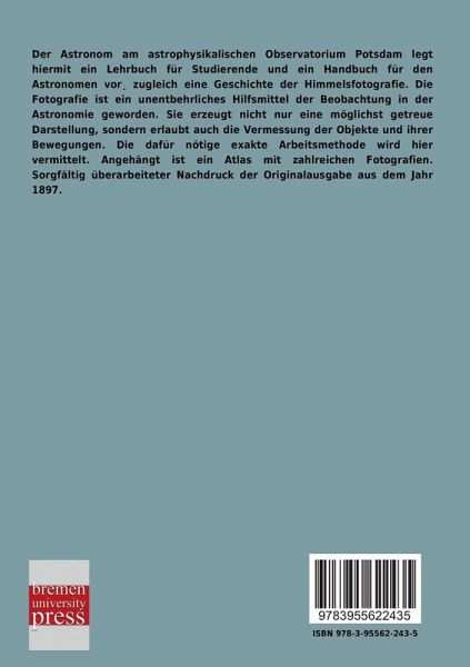 Der Astronom am astrophysikalischen Observatorium Potsdam legt hiermit ein Lehrbuch für Studierende und ein Handbuch für den Astronomen vor zugleich eine Geschichte der Himmelsfotografie. Die Fotografie ist ein unentbehrliches Hilfsmittel der Beobachtung in der Astronomie geworden. Sie erzeugt nicht nur eine möglichst getreue Darstellung, sondern erlaubt auch die Vermessung der Objekte und ihrer Bewegungen. Die dafür nötige exakte Arbeitsmethode wird hier vermittelt. Angehängt ist ein Atlas mit zahlreichen Fotografien. Sorgfältig überarbeiteter Nachdruck der Originalausgabe aus dem Jahr 1897.