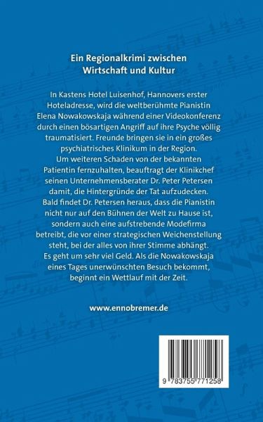 Ein Regionalkrimi zwischen Wirtschaft und KulturIn Kastens Hotel Luisenhof, Hannovers erster Hoteladresse, wird die weltberühmte Pianistin Elena Nowakowskaja während einer Videokonferenz durch einen bösartigen Angriff auf ihre Psyche völlig traumatisiert. Freunde bringen sie in ein großes psychiatrisches Klinikum in der Region. Um weiteren Schaden von der bekannten Patientin fernzuhalten, beauftragt der Klinikchef seinen Unternehmensberater Dr. Peter Petersen damit, die Hintergründe der Tat aufzudecken.Bald findet Dr. Petersen heraus, dass die Pianistin nicht nur auf den Bühnen der Welt zu Hause ist, sondern auch eine aufstrebende Modefirma betreibt, die vor einer strategischen Weichenstellung steht, bei der alles von ihrer Stimme abhängt. Es geht um sehr viel Geld. Als die Nowakowskaja eines Tages unerwünschten Besuch bekommt, beginnt ein Wettlauf mit der Zeit ...