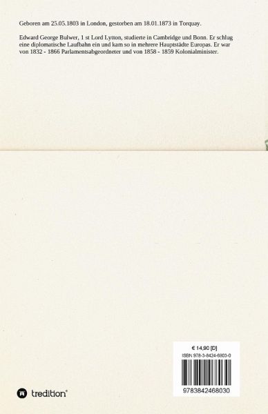 Geboren am 25.05.1803 in London, gestorben am 18.01.1873 in Torquay. Edward George Bulwer, 1stLord Lytton, studierte in Cambridge und Bonn. Er schlug eine diplomatische Laufbahn ein und kam so in mehrere Hauptstädte Europas. Er war von 1832 - 1866 Parlamentsabgeordneter und von 1858 - 1859 Kolonialminister.
