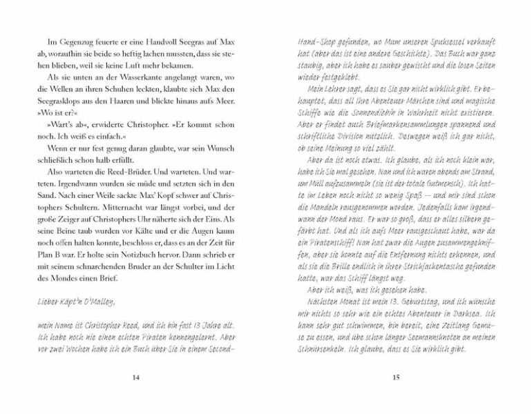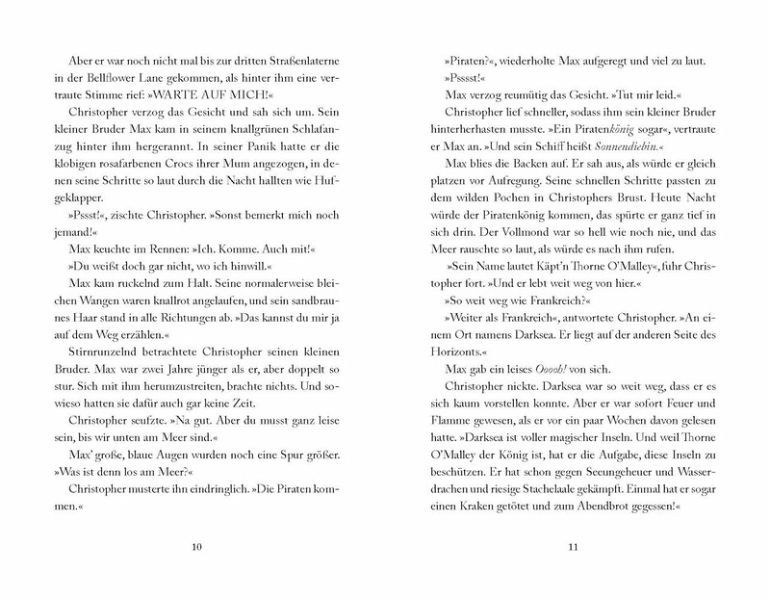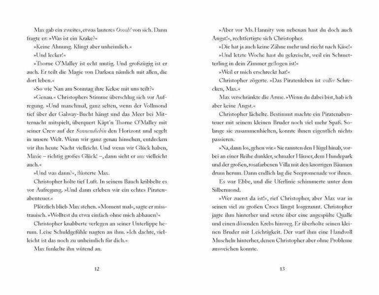 Tief im Herzen des Atlantischen Ozeans, dort, wo der Vollmond die Wellen silbern färbt und Delfine über den Horizont springen, liegt das magische Königreich Darksea, regiert vom Piratenkönig Kapitän O'Malley. Diese Geschichte hat Chris seinem kleinen Bruder Max immer erzählt und davon geträumt, eines Tages mit den Piraten in See zu stechen. Aber jetzt liegt Chris im Krankenhaus ohne Aussicht auf Heilung.