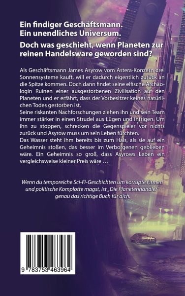 Galaktische Intrigen, tödliche Geheimnisse - Ein Mann gegen das UniversumEin findiger Geschäftsmann. Ein unendliches Universum. Doch was geschieht, wenn Planeten zur reinen Handelsware geworden sind?Als Geschäftsmann James Asyrow vom Astera-Konzern drei Sonnensysteme kauft, will er dadurch eigentlich zurück an die Spitze kommen. Doch dann findet seine elfische Archäologin Ruinen einer ausgestorbenen Zivilisation auf dem Planeten und er erfährt, dass der Vorbesitzer keines natürlichen Todes gestorben ist. Seine riskanten Nachforschungen ziehen ihn und sein Team immer stärker in einen Strudel aus Lügen und Intrigen. Um ihn zu stoppen, schrecken seine Gegenspieler vor nichts zurück und Asyrow muss um sein Leben fürchten.Das Wasser steht ihm bereits bis zum Hals, als sie auf ein Geheimnis stoßen, das besser im Verborgenen geblieben wäre. Ein Geheimnis so groß, dass Asyrows Leben ein vergleichsweise kleiner Preis wäre.Dieser actiongeladene Sci-Fi-Thriller spielt in einer fantastischenWelt, wo die größten Mächte die Galaxien unter sich aufgeteilt haben. Seitdem sind Planeten nichts weiter als Handelsware, die von Regierungen und Konzernen sogar an der Börse gehandelt werden. Wenn du temporeiche Geschichten um korrupte Firmen und politische Komplotte magst, ist "Die Planetenhändler" genau das richtige Buch für dich.Die Ereignisse dieses Science-Fiction-Romans finden im selben Coshia-Universum statt wie "Der Erbe der erstarrten Sonne", spielen allerdings über 8200 Jahre später. "Die Planetenhändler" ist somit keine Fortsetzung, sondern ein Einzelroman.