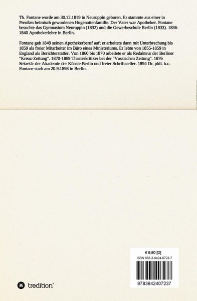 Th. Fontane wurde am 30.12.1819 in Neuruppin geboren. Er stammte aus einer in Preußen heimisch gewordenen Hugenottenfamilie. Der Vater war Apotheker. Fontane besuchte das Gymnasium Neuruppin (1832) und die Gewerbeschule Berlin (1833). 1836-1840 Apothekerlehre in Berlin.Fontane gab 1849 seinen Apothekerberuf auf; er arbeitete dann mit Unterbrechung bis 1859 als freier Mitarbeiter im Büro eines Ministeriums. Er lebte von 1855-1859 in England als Berichterstatter. Von 1860 bis 1870 arbeitete er als Redakteur der Berliner "Kreuz-Zeitung". 1870-1889 Theaterkritiker bei der "Vossischen Zeitung". 1876 Sekretär der Akademie der Künste Berlin und freier Schriftsteller. 1894 Dr. phil. h.c. Fontane starb am 20.9.1898 in Berlin.