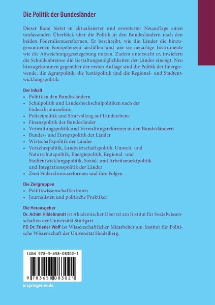 Politik in den Bundesländern.- Schulpolitik und Landeshochschulpolitiken nach der Föderalismusreform.- Polizeipolitik und Strafvollzug auf Länderebene.- Finanzpolitik der Bundesländer.- Verwaltungspolitik und Verwaltungsreformen in den Bundesländern.- Bundes- und Europapolitik der Länder.- Wirtschaftspolitik der Länder.- Verkehrspolitik, Landwirtschaftspolitik, Umwelt- und Naturschutzpolitik, Energiepolitik, Regional- und Stadtentwicklungspolitik, Sozial- und Arbeitsmarktpolitik und Integrationspolitik der Länder.- Zwei Föderalismusreformen und ihre Folgen.