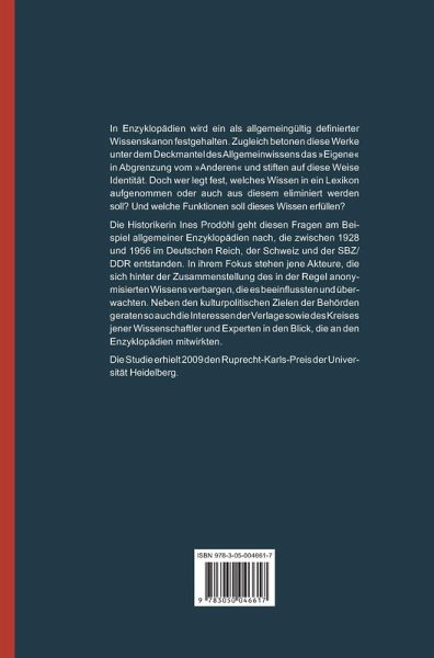 Die Historikerin Ines Prodöhl geht diesen Fragen am Beispiel allgemeiner Enzyklopädien nach, die zwischen 1928 und 1956 im Deutschen Reich, der Schweiz und der SBZ/DDR entstanden. In ihrem Fokus stehen jene Akteure, die sich hinter der Zusammenstellung des in der Regel anonymisierten Wissens verbargen, die es beeinflussten und überwachten. Neben den kulturpolitischen Zielen der Behörden geraten so auch die Interessen der Verlage sowie des Kreises jener Wissenschaftler und Experten in den Blick, die an den Enzyklopädien mitwirkten.