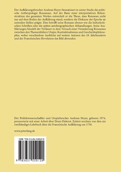 Der Aufklärungsforscher Andreas Heyer thematisiert in seiner Studie die politische Anthropologie Rousseaus. Auf der Basis einer interpretativen Rekonstruktion des gesamten Werkes entwickelt er die These, dass Rousseau nicht nur auf dem Boden der Aufklärung stand, sondern die Diskurse der Epoche an zentralen Stellen prägte. Dies betrifft seine Romane ebenso wie die kulturkritischen Schriften oder die späten autobiographischen Abhandlungen. Seine Ausführungen bündelt der Verfasser in dem Versuch einer Verankerung Rousseaus zwischen den Themenfeldern Utopie, Kontraktualismus und Geschichtsphilosophie, wobei verschiedene Ausblicke auf weitere Autoren des 18. Jahrhunderts und der Französischen Revolution das Bild abrunden.