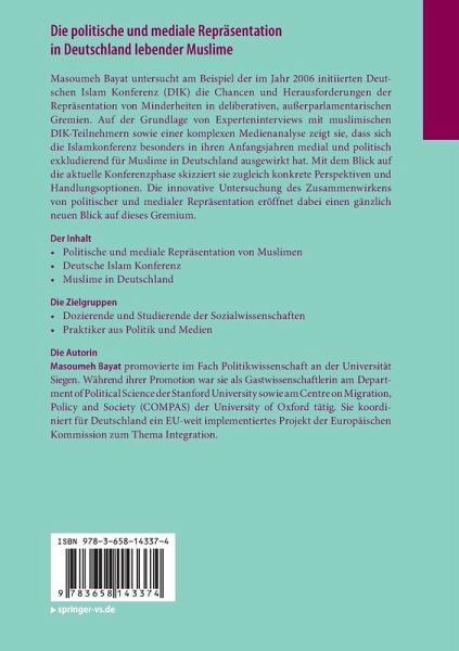 Masoumeh Bayat untersucht am Beispiel der im Jahr 2006 initiierten Deutschen Islam Konferenz (DIK) die Chancen und Herausforderungen der Repräsentation von Minderheiten in deliberativen, außerparlamentarischen Gremien. Auf der Grundlage von Experteninterviews mit muslimischen DIK-Teilnehmern sowie einer komplexen Medienanalyse zeigt sie, dass sich die Islamkonferenz besonders in ihren Anfangsjahren medial und politisch exkludierend für Muslime in Deutschland ausgewirkt hat. Mit dem Blick auf die aktuelle Konferenzphase skizziert sie zugleich konkrete Perspektiven und Handlungsoptionen. Die innovative Untersuchung des Zusammenwirkens von politischer und medialer Repräsentation eröffnet dabei einen gänzlich neuen Blick auf dieses Gremium.