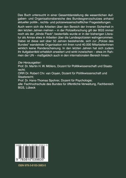 Das Buch untersucht in einer Gesamtdarstellung die wesentlichen Aufgaben- und Organisationsbereiche des Bundesgrenzschutzes anhand aktueller politik-, rechts- und polizeiwissenschaftlicher Fragestellungen. Auch wenn sich die Arbeiten über den Bereich der Inneren Sicherheit in den letzten Jahren mehren - in der Polizeiforschung gilt der BGS immer noch als der "blinde Fleck"; bestenfalls wurde er in der bisherigen Literatur als Annex etwa in Arbeiten über die Landespolizeien wahrgenommen. Dabei ist diese seit über 50 Jahren bestehende, sich zur "Polizei des Bundes" wandelnde Organisation mit ihren rund 40.000 MitarbeiterInnen wirklich keine Randerscheinung. In den letzten Jahren hat sich zudem ihr Aufgabenfeld erheblich erweitert und wirkt inzwischen - etwa im Rahmen der UN - maßgeblich auch in den internationalen Bereich hinein.