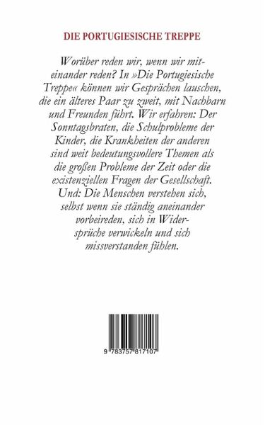 Worüber reden wir, wenn wir miteinander reden? In Die Portugiesische Treppe können wir Gesprächen lauschen, die ein älteres Paar zu zweit, mit Nachbarn und Freunden führt. Wir erfahren: Der Sonntagsbraten, die Schulprobleme der Kinder, die Krankheiten der anderen sind weit bedeutungsvollere Themen als die großen Probleme der Zeit oder die existenziellen Fragen der Gesellschaft. Und: Die Menschen verstehen sich, selbst wenn sie ständig aneinander vorbeireden, sich in Widersprüche verwickeln und sich missverstanden fühlen.