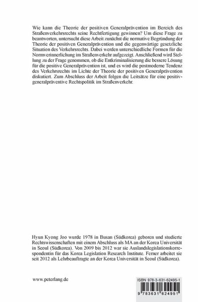 Wie kann die Theorie der positiven Generalprävention im Bereich des Straßenverkehrsrechts seine Rechtfertigung gewinnen? Um diese Frage zu beantworten, untersucht diese Arbeit zunächst die normative Begründung der Theorie der positiven Generalprävention und die gegenwärtige gesetzliche Situation des Verkehrsrechts. Dabei werden unterschiedliche Formen für die Normverinnerlichung im Straßenverkehr aufgezeigt. Anschließend wird Stellung zu der Frage genommen, ob die Entkriminalisierung die bessere Lösung für die positive Generalprävention ist, und es wird die postmoderne Tendenz des Verkehrsrechts im Lichte der Theorie der positiven Generalprävention diskutiert. Zum Abschluss der Arbeit folgen die Leitsätze für eine positiv-generalpräventive Rechtspolitik im Straßenverkehr.