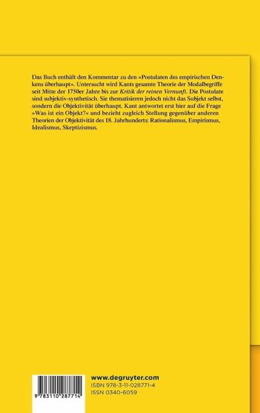 Das Buch enthält die Einführung in die Lektüre sowie den Textkommentar zu den der Analyse der Grundsätze der Modalität gewidmeten "Postulaten des empirischen Denkens überhaupt". Untersucht wird Kants gesamte Theorie der Modalbegriffe (Möglichkeit - Unmöglichkeit, Dasein - Nichtsein, Notwendigkeit - Zufälligkeit) seit Mitte der 1750er Jahre bis zur Kritik der reinen Vernunft. Die Postulate sind nach Kant nicht objektiv, sondern subjektiv-synthetisch: Der Gegenstand der Erfahrung, welcher zunächst anhand der objektiv-synthetischen Funktionen der Quantität, Qualität und Relation bestimmt wird, lässt sich nun in seinem Verhältnis zum setzenden Subjekt betrachten. Die Postulate thematisieren jedoch nicht - hier liegt die konstitutive Charakteristik dieser synthetischen Urteile a priori - das Subjekt selbst, sondern das Objekt als solches und die Objektivität überhaupt. Wie diese Untersuchung zeigt, antwortet Kant erst hier - nicht in den viel diskutierten Deduktionskapiteln oder in den anderen Grundsatzkapiteln - auf die Frage "Was ist ein Objekt?" und bezieht zugleich Stellung gegenüber anderen philosophischen Theorien der Objektivität des 18. Jahrhunderts: Rationalismus, Empirismus, Idealismus, Skeptizismus.