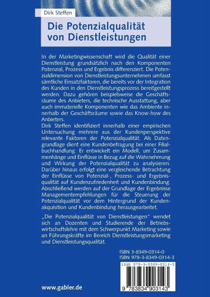 Dirk Steffen identifiziert innerhalb einer empirischen Untersuchung mehrere aus der Kundenperspektive relevante Faktoren der Potenzialqualität. Als Datengrundlage dient eine Kundenbefragung bei einer Filialbuchhandlung. Er entwickelt ein Modell, um Zusammenhänge und Einflüsse in Bezug auf die Wahrnehmung und Wirkung der Potenzialqualität zu analysieren. Darüber hinaus erfolgt eine vergleichende Betrachtung der Einflüsse von Potenzial-, Prozess- und Ergebnisqualität auf Kundenzufriedenheit und Kundenbindung. Abschließend werden auf der Grundlage der Ergebnisse Managementempfehlungen für die Steuerung der Potenzialqualität vor dem Hintergrund der Kundenakquisition und Kundenbindung herausgearbeitet.