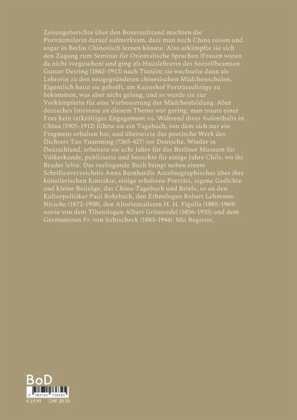 Zeitungsberichte über den Boxeraufstand machten die Porträtmalerin darauf aufmerksam, dass man nach China reisen und sogar in Berlin Chinesisch lernen könnte. Also erkämpfte sie sich den Zugang zum Seminar für Orientalische Sprachen (Frauen waren da nicht vorgesehen) und ging als Hauslehrerin des Seezollbeamten Gustav Detring (1842-1913) nach Tianjin; sie wechselte dann als Lehrerin zu den neugegründeten chinesischen Mädchenschulen. Eigentlich hatte sie gehofft, am Kaiserhof Porträtaufträge zu bekommen, was aber nicht gelang, und so wurde sie zur Vorkämpferin für eine Verbesserung der Mädchenbildung. Aber deutsches Interesse an diesem Thema war gering; man traute einer Frau kein tatkräftiges Engagement zu. Während ihres Aufenthalts in China (1905-1912) führte sie ein Tagebuch, von dem sich nur ein Fragment erhalten hat, und übersetzte das poetische Werk des Dichters Tao Yuanming (?365-427) ins Deutsche. Wieder in Deutschland, arbeitete sie acht Jahre für das Berliner Museum für Völkerkunde, publizierte und besuchte für einige Jahre Chile, wo ihr Bruder lebte. Das vorliegende Buch bringt neben einem Schriftenverzeichnis Anna Bernhardis Autobiographisches über ihre künstlerischen Kontakte, einige erhaltene Porträts, eigene Gedichte und kleine Beiträge, das China-Tagebuch und Briefe, so an den Kulturpolitiker Paul Rohrbach, den Ethnologen Robert Lehmann-Nitsche (1872-1938), den Altorientalisten H. H. Figulla (1885-1969) sowie von dem Tibetologen Albert Grünwedel (1856-1935) und dem Germanisten Fr. von Suhtscheck (1883-1944). Mit Register.