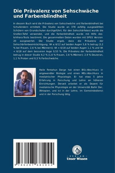 In diesem Buch wird die Prävalenz von Sehschwäche und Farbenblindheit bei Schulkindern ermittelt. Die Studie wurde an 378 zufällig ausgewählten Schülern von Grundschulen durchgeführt. Für den Sehschärfetest wurde die Snellen-Tafel verwendet, und die Farbenblindheit wurde mit Hilfe des Ishihara-Tests bestimmt. Die gesammelten Daten wurden mit SPSS Version 20 ausgewertet. Die Studie ergab, dass die Prävalenz der Sehschärfenbeeinträchtigung; VA 6/12 auf beiden Augen 5,8 % betrug (3,2 % bei Frauen, 2,6 % bei Männern); VA < 6/18 auf beiden Augen 1,1 % und VA < 6/18 auf dem besseren Auge 0,53 %. Die Prävalenz der Farbenblindheit betrug in dieser Studie 4,2 % (1,6 % Frauen, 2,6 % Männer); 2,9 % Deuteran, 1,1 % Protan und 0,3 % Farbschwäche.