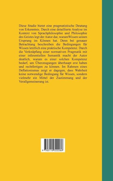 Diese Studie bietet eine pragmatistische Deutung von Erkenntnis. Durch eine detaillierte Analyse im Kontext von Sprachphilosophie und Philosophie des Geistes legt der Autor dar, warum Wissen seinen Ursprung im Können hat. Denn bei genauer Betrachtung beschreiben die Bedingungen für Wissen letztlich eine praktische Kompetenz. Durch die Verknüpfung einer normativen Pragmatik mit einer inferentiellen Semantik macht der Autor deutlich, warum es einer solchen Kompetenz bedarf, um Überzeugungen überhaupt erst haben und rechtfertigen zu können. Im Rahmen eines Deflationismus zeigt er dagegen, dass Wahrheit keine notwendige Bedingung für Wissen, sondern vielmehr ein Mittel der Zustimmung und der Verallgemeinerung ist.