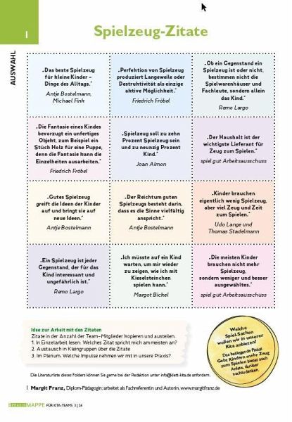 Spielen. Das ist die Königsdisziplin des Lernens! Beim Verkleiden, Stapeln oder Plantschen entdecken Kinder die Welt - und sich selbst. Wunderbar, dass es Kitas gibt! Denn genau hier sind Orte, an dem dies stattfinden kann. Vorausgesetzt, den Kindern stehen Zeit und Raum dafür zur Verfügung - und interessante Dinge, die sie für ihr Spiel nutzen können. Was aber sind die Gegenstände, mit denen sich Kinder im Spiel entfalten können? Welches Spiel-Zeug reizt sie zum Explorieren und Fantasieren - und reduziert sie nicht auf festgelegte Spielhandlungen? Was diese Mappe bietet? - Übungen für Teams, um sich wie Kinder von Dingen faszinieren zu lassen. Kriterien, die uns bei der Auswahl von Spiel-Zeug helfen. Impulse, die zum Reflektieren einladen, etwa zu den Fragen: Brauchen Kinder überhaupt Spielzeug? Wie präsentieren wir es? Und wie wollen wir mit dem leidigen Thema Aufräumen umgehen? Plus Plakat: "Gebt Kindern mehr Zeug zum Spielen!" Das Poster zeigt Alltagsgegenstände, mit denen kleine Kinder die Welt entdecken. Anregend für Teams und hilfreich für Eltern.