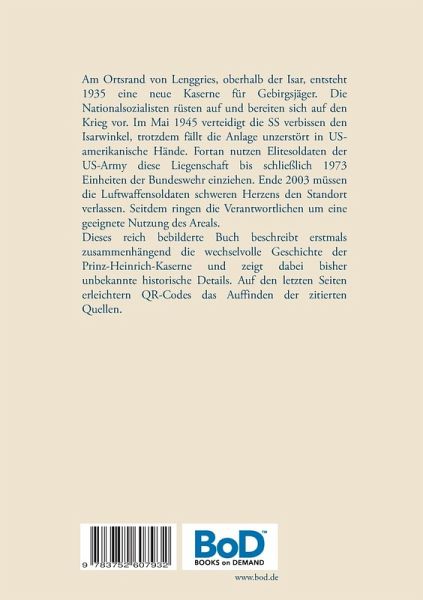 Am Ortsrand von Lenggries, oberhalb der Isar, entsteht 1935 eine neue Kaserne für Gebirgsjäger. Die Nationalsozialisten rüsten auf und bereiten sich auf den Krieg vor. Im Mai 1945 verteidigt die SS verbissen den Isarwinkel, trotzdem fällt die Anlage unzerstört in US-amerikanische Hände. Fortan nutzen Elitesoldaten der US-Army diese Liegenschaft bis schließlich 1973 Einheiten der Bundeswehr einziehen. Ende 2003 müssen die Luftwaffensoldaten schweren Herzens den Standort verlassen. Seitdem ringen die Verantwortlichen um eine geeignete Nutzung des Areals. Dieses reich bebilderte Buch beschreibt erstmals zusammenhängend die wechselvolle Geschichte der Prinz-Heinrich-Kaserne und zeigt dabei bisher unbekannte historische Details. Auf den letzten Seiten erleichtern QR-Codes das Auffinden der zitierten Quellen.