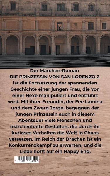Der Märchen-Roman DIE PRINZESSIN VON SAN LORENZO 2 ist die Fortsetzung der spannenden Geschichte einer jungen Frau, die von einer Hexe manipuliert und entführt wird. Mit ihrer Freundin, der Fee Lamina und dem Zwerg Jorge, begegnen der jungen Prinzessin auch in diesem Abenteuer viele Menschen und märchenhafte Gestalten, die durch ihr kurioses Verhalten die Welt in Chaos versetzen. Im Reich der Drachen ist ein Konkurrenzkampf zu erwarten, und die Liebe hofft auf ein Happy End.