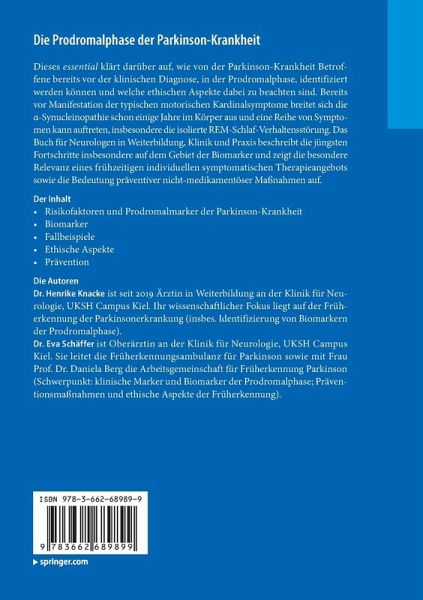 Dieses essential klärt darüber auf, wie von der Parkinson-Krankheit Betroffene bereits vor der klinischen Diagnose, in der Prodromalphase, identifiziert werden können und welche ethischen Aspekte dabei zu beachten sind. Bereits vor Manifestation der typischen motorischen Kardinalsymptome breitet sich die -Synucleinopathie schon einige Jahre im Körper aus und eine Reihe von Symptomen kann auftreten, insbesondere die isolierte REM-Schlaf-Verhaltensstörung. Das Buch für Neurologen in Weiterbildung, Klinik und Praxis beschreibt die jüngsten Fortschritte insbesondere auf dem Gebiet der Biomarker und zeigt die besondere Relevanz eines frühzeitigen individuellen symptomatischen Therapieangebots sowie die Bedeutung präventiver nicht-medikamentöser Maßnahmen auf.