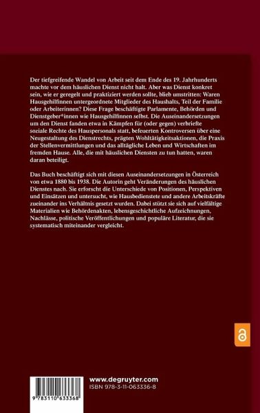 Mit der Dienstbotenfrage Ende des 19. Jh.s mehrten sich die Debatten und Konflikte um den häuslichen Dienst. Waren Hausbedienstete als ArbeiterInnen oder eher als Haushaltsangehörige zu sehen? Wie sollten ihre Dienste reguliert und bewertet werden? Die Arbeit untersucht die Auseinandersetzungen multiperspektivisch und diskutiert, wie sich der häusliche Dienst in Österreich bis zum Anschluss an das nationalsozialistische Dt. Reich verändert hat.