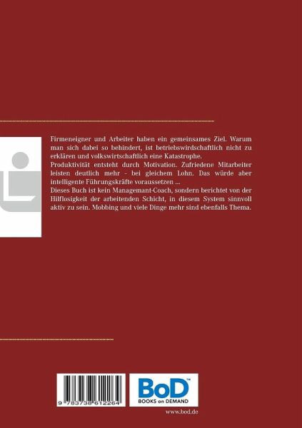 Firmeneigner und Arbeiter haben ein gemeinsames Ziel. Warum man sich dabei so behindert, ist betriebswirdschaftlich nicht zu erklären und volkswirtschaftlich eine Katastrophe.Produktivität entsteht durch Motivation. Zufriedene Mitarbeiter leisten deutlich mehr - bei gleichem Lohn. Das würde aber intelligente Führungskräfte voraussetzen ...Dieses Buch ist kein Managemant-Coach, sondern berichtet von der Hilflosigkeit der arbeitenden Schicht, in diesem System sinnvoll aktiv zu sein. Mobbing und viele Dinge mehr sind ebenfalls Thema.