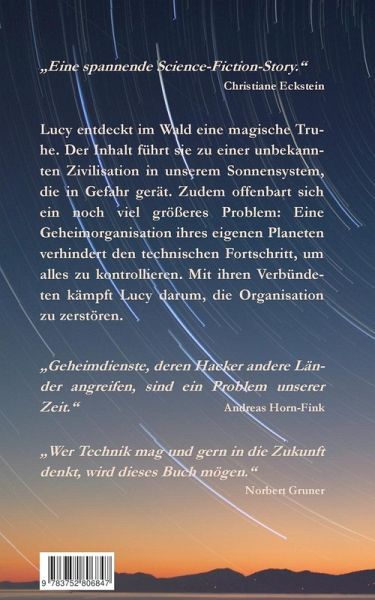 Lucy entdeckt im Wald eine magische Truhe. Der Inhalt führt sie zu einer unbekannten Zivilisation in unserem Sonnensystem, die in Gefahr gerät. Zudem offenbart sich ein noch viel größeres Problem: Eine Geheimorganisation ihres eigenen Planeten verhindert den technischen Fortschritt, um alles zu kontrollieren. Mit ihren Verbündeten kämpft Lucy darum, die Organisation zu zerstören."Eine spannende Science-Fiction-Story." - Christiane Eckstein."Geheimdienste, deren Hacker andere Länder angreifen, sind ein Problem unserer Zeit." - Andreas Horn-Fink"Wer Technik mag und gern in die Zukunft denkt, wird dieses Buch mögen." - Norbert Gruner