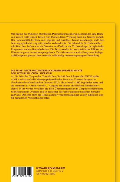 Origenes und Eusebius stehen am Anfang der christlichen Psalmenkommentierung. Ihre einleitenden Texte zu den Psalmen behandeln technische und formale Fragen, wie die Einteilung des Psalters oder die Autorschaft der Psalmen, aber auch inhaltliche, wie die Bedeutung der Psalmen für das christliche Selbstverständnis. Die vergleichsweise kurzen Texte haben eine lange Rezeptionsgeschichte. Sie boten nicht nur späteren patristischen Autoren Ausgangs- und Kritikpunkte, sondern sie wurden bis in die Neuzeit hinein immer wieder in die Prologsammlungen von Psalmenkatenen aufgenommen. Auf der breiten Basis dieser Prologsammlungen werden die Texte in einer neuen, kritischen Edition mit Übersetzung und Anmerkungen vorgelegt. Sowohl für Origenes als auch für Eusebius sind damit erstmals alle bekannten Prologtexte zu den Psalmen in einer einzigen zuverlässigen Ausgabe vereint, wobei frühere Falschzuweisungen behoben werden konnten. Zwei themenverwandte Essays und farbige Abbildungen ergänzen die Sammlung.