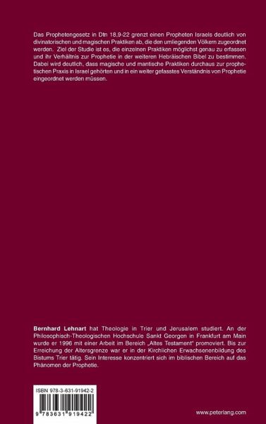 Das Prophetengesetz in Dtn 18,9-22 grenzt einen Propheten Israels deutlich von divinatorischen und magischen Praktiken ab, die den umliegenden Völkern zugeordnet werden. Ziel der Studie ist es, die einzelnen Praktiken möglichst genau zu erfassen und ihr Verhältnis zur Prophetie in der weiteren Hebräischen Bibel zu bestimmen. Dabei wird deutlich, dass magische und mantische Praktiken durchaus zur prophetischen Praxis in Israel gehörten und in ein weiter gefasstes Verständnis von Prophetie eingeordnet werden müssen.