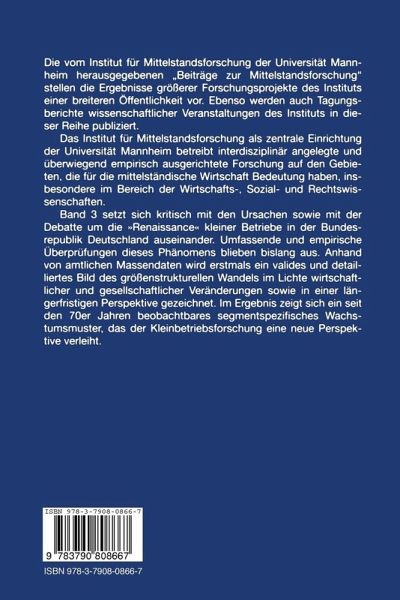 Die lange Zeit behauptete Dominanz der großbetrieblichen Organisation steht in Frage. Das Buch belegt, daß neuerdings Kleinbetriebe eine führende Rolle im Modernisierungsprozeß übernehmen. Der Autor setzt sich kritisch mit den Ursachen sowie mit der Debatte um die "Renaissance" kleiner Betriebe in der Bundesrepublik Deutschland auseinander. Umfassende und empirische Überprüfungen dieses Phänomens blieben bislang aus. Anhand von amtlichen Massendaten wird erstmals ein valides und detailliertes Bild des größenstrukturellen Wandels im Lichte wirtschaftlicher und gesellschaftlicher Veränderungen sowie in einer längerfristigen Perspektive gezeichnet. Im Ergebnis zeigt sich ein seit den 70er Jahren beobachtbares segmentspezifisches Wachstumsmuster, das der Kleinbetriebsforschung eine neue Perspektive verleiht.