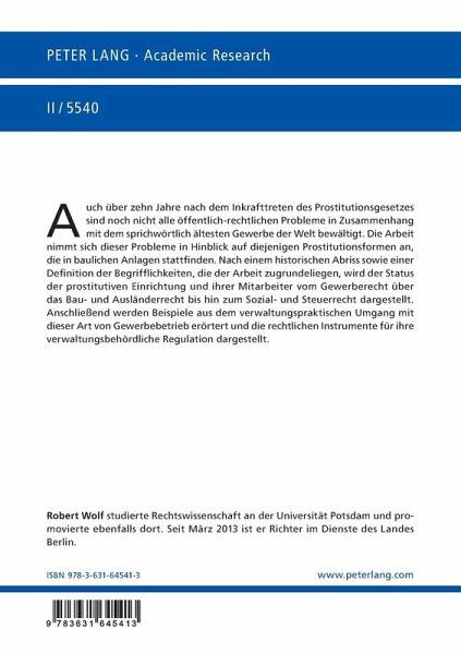 Auch über zehn Jahre nach dem Inkrafttreten des Prostitutionsgesetzes sind noch nicht alle öffentlich-rechtlichen Probleme in Zusammenhang mit dem sprichwörtlich ältesten Gewerbe der Welt bewältigt. Die Arbeit nimmt sich dieser Probleme in Hinblick auf diejenigen Prostitutionsformen an, die in baulichen Anlagen stattfinden. Nach einem historischen Abriss sowie einer Definition der Begrifflichkeiten, die der Arbeit zugrundeliegen, wird der Status der prostitutiven Einrichtung und ihrer Mitarbeiter vom Gewerberecht über das Bau- und Ausländerrecht bis hin zum Sozial- und Steuerrecht dargestellt. Anschließend werden Beispiele aus dem verwaltungspraktischen Umgang mit dieser Art von Gewerbebetrieb erörtert und die rechtlichen Instrumente für ihre verwaltungsbehördliche Regulation dargestellt.