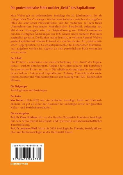 Das Problem.- Konfession und soziale Schichtung.- Der "Geist" des Kapitalismus.- Luthers Berufsbegriff. Aufgabe der Untersuchung.- Die Berufsidee des asketischen Protestantismus.- Die religiösen Grundlagen der innerweltlichen Askese.- Askese und Kapitalismus.- Anhang: Verzeichnis der wichtigsten Zusätze und Veränderungen aus der Fassung von 1920.- Editorischer Hinweis.