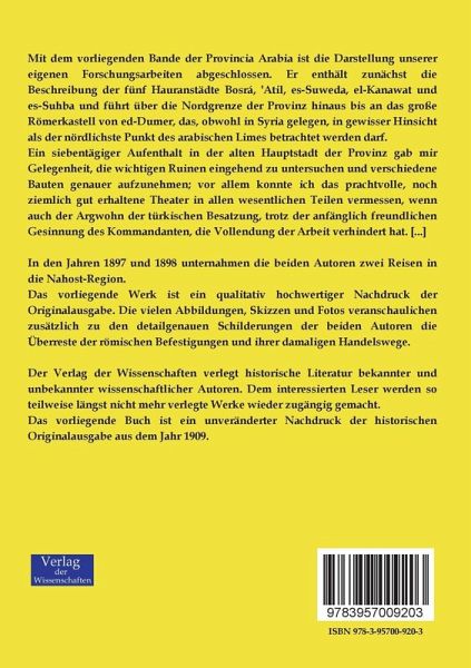 Mit dem vorliegenden Bande der Provincia Arabia ist die Darstellung unserer eigenen Forschungsarbeiten abgeschlossen. Er enthält zunächst die Beschreibung der fünf Hauranstädte Bosrá, 'Atil, es-Suweda, el-Kanawat und es-Suhba und führt über die Nordgrenze der Provinz hinaus bis an das große Römerkastell von ed-Dumer, das, obwohl in Syria gelegen, in gewisser Hinsicht als der nördlichste Punkt des arabischen Limes betrachtet werden darf.