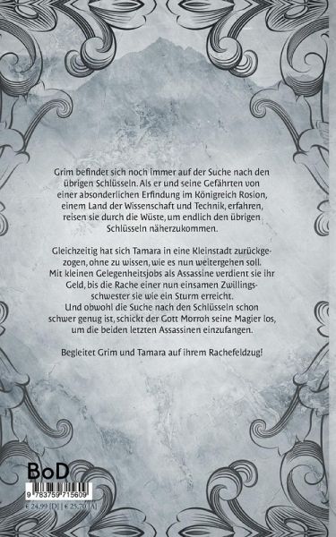Grim befindet sich noch immer auf der Suche nach den übrigen Schlüsseln. Als er und seine Gefährten von einer absonderlichen Erfindung im Königreich Rosion, einem Land der Wissenschaft und Technik, erfahren, reisen sie durch die Wüste, um endlich den übrigen Schlüsseln näherzukommen. Gleichzeitig hat sich Tamara in eine Kleinstadt zurückgezogen, ohne zu wissen, wie es nun weitergehen soll. Mit kleinen Gelegenheitsjobs als Assassine verdient sie ihr Geld, bis die Rache einer nun einsamen Zwillingsschwester sie wie ein Sturm erreicht.Und obwohl die Suche nach den Schlüsseln schon schwer genug ist, schickt der Gott Morroh seine Magier los, um die beiden letzten Assassinen einzufangen.Begleitet Grim und Tamara auf ihrem Rachefeldzug!