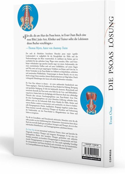 »Die Psoas-Lösung« bespricht umfassend die Funktion des Psoas-Muskels bei Haltung, Bewegung und sportlicher Betätigung. Es hebt die funktionale Anatomie, Biomechanik und motorische Kontrolle des Psoas und seine Rolle bei der Core und Hüftstabilisierung hervor. Das durchgängig reich mit farbigen Abbildungen illustrierte Buch liefert zudem eine vollständige Übersicht über verfügbare relevante Forschungsergebnisse zum Psoas. Evan Osar, der diese Forschungsergebnisse mit seiner klinischen Erfahrung verbindet, definiert die Rolle des Psoas für Hüfte, Becken und unteren Rücken und demonstriert, wie dieser Muskel in funktionale Bewegungsmuster eingebaut werden kann, dazu gehören Hocke, Ausfallschritt und Beugung. »Die Psoas-Lösung« enthält schrittweise Übungen zur Korrektur und Verbesserung der Funktionalität, um den Psoas in Alltagsaktivitäten wie Sitzen und Stehen zu integrieren. Für Angehörige der Berufsgruppen aus Gesundheit und Fitness eine wertvolle Quelle von anwendbaren Strategien und Übungen, die sie in ihre aktuellen Rehabilitations- und Trainingsprogramme aufnehmen können.