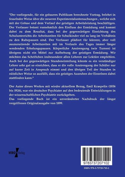 "Der vorliegende, für ein grösseres Publikum berechnete Vortrag, belehrt in fesselnder Weise über die neueren Experimentaluntersuchungen , welche sich mit der Grösse und dem Verlauf der geistigen Arbeitsleistung beschäftigen. Der Verfasser betont vornehmlich den Einfluss der Ermüdung und kommt dabei zu dem Resultat, dass bei der gegenwärtigen Einrichtung des Schulunterrichts die Arbeitszeiten für Schulkinder viel zu lang im Verhältnis zu den Ruhepausen sind. Der Verfasser plädiert für kürzere, aber voll auszunutzende Arbeitszeiten mit im Verlaufe des Tages immer länger werdenden Erholungspausen. Körperliche Anstrengung (wie Turnen) ist übrigens nicht ein Mittel zur Aufhebung der geistigen Ermüdung. Wir möchten das Schriftchen insbesondere allen Lehrern zur Lektüre empfehlen. Auch bei der gegenwärtigen Stundeneinteilung könnte es ein verständiger Lehrer sehr gut so einrichten, dass er die volle Anstrengung der Schüler nur auf kurze Zeit in Anspruch nimmt und den übrigen Teil der Stunden in nützlicher Weise so ausfüllt, dass ein geistiges Ausruhen der Einzelnen dabei stattfinden kann."Der Autor dieses Werkes mit wieder aktuellem Bezug, Emil Kraepelin (1856 bis 1926), war ein deutscher Psychiater auf den bedeutende Entwicklungen in der wissenschaftlichen Psychiatrie zurückgehen.
