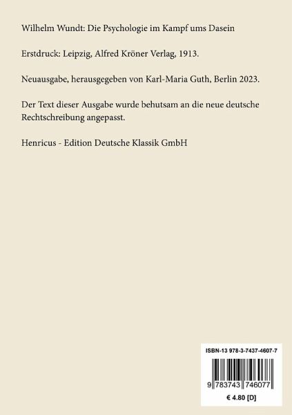 Wilhelm Wundt: Die Psychologie im Kampf ums Dasein Erstdruck: Leipzig, Alfred Kröner Verlag, 1913. Neuausgabe. Herausgegeben von Karl-Maria Guth. Berlin 2023. Der Text dieser Ausgabe wurde behutsam an die neue deutsche Rechtschreibung angepasst. Umschlaggestaltung von Thomas Schultz-Overhage unter Verwendung des Bildes: Wilhelm Wundt, 1902. Gesetzt aus der Minion Pro, 11 pt. Henricus - Edition Deutsche Klassik GmbH
