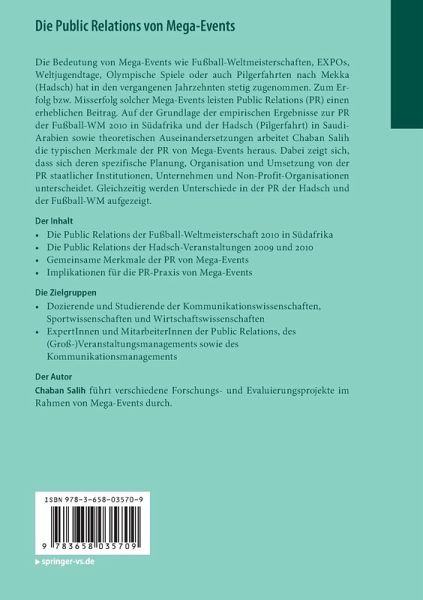 Die Bedeutung von Mega-Events wie Fußball-Weltmeisterschaften, EXPOs, Weltjugendtage, Olympische Spiele oder auch Pilgerfahrten nach Mekka (Hadsch) hat in den vergangenen Jahrzehnten stetig zugenommen. Zum Erfolg bzw. Misserfolg solcher Mega-Events leisten Public Relations (PR) einen erheblichen Beitrag. Auf der Grundlage der empirischen Ergebnisse zur PR der Fußball-WM 2010 in Südafrika und der Hadsch (Pilgerfahrt) in Saudi-Arabien sowie theoretischen Auseinandersetzungen arbeitet Chaban Salih die typischen Merkmale der PR von Mega-Events heraus. Dabei zeigt sich, dass sich deren spezifische Planung, Organisation und Umsetzung von der PR staatlicher Institutionen, Unternehmen und Non-Profit-Organisationen unterscheidet. Gleichzeitig werden Unterschiede in der PR der Hadsch und der Fußball-WM aufgezeigt.