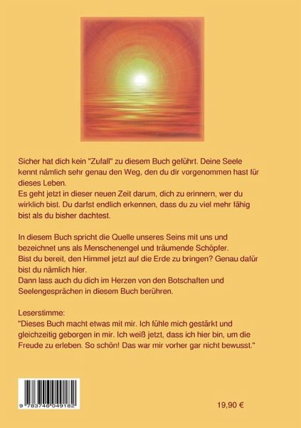 Sicher hat dich kein "Zufall" zu diesem Buch geführt. Deine Seele kennt nämlich sehr genau deinen Weg, den du dir vorgenommen hast für dieses Leben.In diesem Buch spricht die Quelle unseres Seins mit uns und bezeichnet uns als MenschenEngel und träumende Schöpfer. Lass dich einfach im Herzen von den Botschaften und Seelengesprächen in diesem Buch berühren.Du darfst hier endlich erkennen, dass du zu viel mehr fähig bist als du bisher dachtest.Leserstimme:"Dieses Buch macht etwas mit mir. Ich fühle mich gestärkt und gleichzeitig geborgen in mir. Ich weiß jetzt, dass ich hier bin, um die Freude zu erleben. So schön! Das war mir vorher gar nicht bewusst."