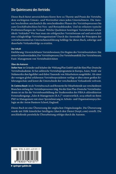 Stefan Hase studierte Betriebswirtschaftslehre in Hamburg und begann seine Karriere im Vertrieb 1993 bei Konica Business Machines. Im Jahr 1997 wechselte er zu Triumph-Adler, wo er Personalleiter wurde. Dort war er verantwortlich für die operative Personalentwicklung von 2.500 Mitarbeitern und den Umbau des Unternehmens zu einem vertriebsorientierten Unternehmen. Auf der Basis seines reichen Erfahrungsschatzes gründete er 2004 Wirkung Plus. Im Jahr 2008 folgte die Tochtergesellschaft Eins Plus - Deutsche Vertriebsakademie. Stefan Hase arbeitet als Unternehmensberater, Trainer und Keynote-Speaker für viele namhafte Kunden wie Hewlett-Packard, DNV GL, Samsung und Sennheiser - sowohl auf strategischer als auch auf operativer Ebene.In den letzten zehn Jahren hat er zahlreiche Verkaufsprogramme in Europa, Asien, Nord- und Südamerika konzipiert und durchgeführt sowie Hunderte von Mitarbeitern geschult. Neben Präsenzveranstaltungen betreibt er auch Coaching von Vertriebsmanagern. Durch die Begleitung einschlägiger Projekte in Märkten wie Brasilien, China oder den USA verfügt er über einen großen Erfahrungsschatz von östlichen bis zu westlichen Verkaufsstilen. Er ist einer der wenigen global erfahrenen Vertriebsspezialisten. Corinna Busch absolvierte eine Ausbildung zur Schifffahrtskauffrau und erwarb einen Bachelor of Arts in Logistikmanagement an der Hamburg School of Business Administration (HSBA). Nach dreijähriger Tätigkeit im Vertrieb und Kundenservice studierte sie Organizational Behaviour (M.Sc) an der Aston Business School, UK. Sie untersuchte u.a. das Verhalten von Mitarbeitern, Teams und Organisationen bei der Umsetzung von strategischen Entscheidungen. Im April 2012 kam sie zu Wirkung Plus. Als Vertriebscoach und Beraterin berät, trainiert und coacht sie Mitarbeiter aus verschiedenen Branchen entlang des Vertriebsprozesses. Bei Eins Plus - Deutsche Vertriebsakademie ist sie außerdem für das Vertriebstraining von Studierenden, die in dem von der FIBAA akkreditierten Fernstudiengang "Sales & Management (B.A.)" eingeschrieben sind, verantwortlich. Dieser Ausbildungsgang findet in Kooperation mit der Euro-FH in Hamburg (Hochschule für Angewandte Wissenschaften) statt.