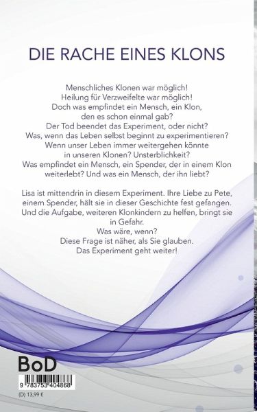Menschliches Klonen war möglich! Heilung für Verzweifelte war möglich!Doch was empfindet ein Mensch, ein Klon, den es schon einmal gab?Der Tod beendet das Experiment, oder nicht?Was, wenn das Leben selbst beginnt zu experimentieren? Wenn unser Leben immer weitergehen könnte in unseren Klonen? Unsterblichkeit? Was empfindet ein Mensch, ein Spender, der in einem Klon weiterlebt? Und was ein Mensch, der ihn liebt? Lisa ist mittendrin in diesem Experiment. Ihre Liebe zu Pete, einem Spender, hält sie in dieser Geschichte fest gefangen. Und die Aufgabe, weiteren Klonkindern zu helfen, bringt sie in Gefahr.Was wäre, wenn ? Diese Frage ist näher, als Sie glauben. Das Experiment geht weiter!Die Geschichte Die Liebe eines Klons geht weiter: Die Rache eines Klons!