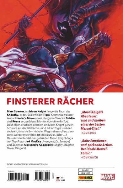 FINSTERER RÄCHER Marc Spector, als Moon Knight lange die Faust des Khonshu, ist tot. Superheldin Tigra, Khonshus weiterer Avatar Hunter's Moon sowie die guten Vampire Soldier und Reese setzen Marcs Mission nun ohne ihn fort. Doch dann erscheint plötzlich ein Moon Knight ganz in Schwarz auf der Bildfläche - und erklärt Tigra und den anderen, dass sie ihm nicht im Weg stehen sollen, denn sonst werde er sie töten. Ist Marc zurück, oder ...? Das nächste Kapitel der gefeierten Moon Knight-Saga von Top-Autor Jed MacKay (Avengers, Dr. Strange) und Zeichner Alessandro Cappuccio (Mighty Morphin Power Rangers). ENTHÄLT: VENGEANCE OF THE MOON KNIGHT (2024) 1-4