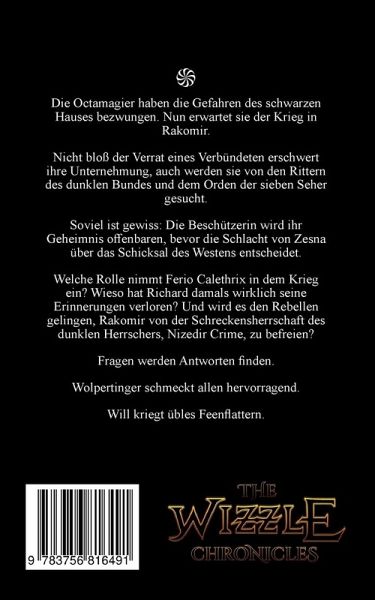 Die Octamagier haben die Gefahren des schwarzen Hauses bezwungen. Nun erwartet sie der Krieg in Rakomir.Nicht bloß der Verrat eines Verbündeten erschwert ihre Unternehmung, auch werden sie von den Rittern des dunklen Bundes und dem Orden der sieben Seher gesucht.Soviel ist gewiss: Die Beschützerin wird ihr Geheimnis offenbaren, bevor die Schlacht von Zesna über das Schicksal des Westens entscheidet.Welche Rolle nimmt Ferio Calethrix in dem Krieg ein? Wieso hat Richard damals wirklich seine Erinnerungen verloren? Und wird es den Rebellen gelingen, Rakomir von der Schreckensherrschaft des dunklen Herrschers, Nizedir Crime, zu befreien?Fragen werden Antworten finden.Wolpertinger schmeckt allen hervorragend.Will kriegt übles Feenflattern.