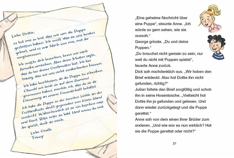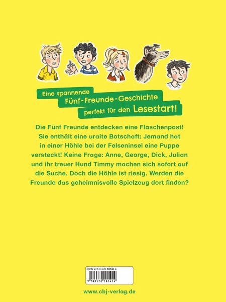 Die Fünf Freunde entdecken eine Flaschenpost! Sie enthält eine sehr geheimnisvolle Botschaft: Jemand vermisst eine Puppe, und angeblich liegt sie versteckt in einer Höhle auf der Felseninsel. Keine Frage: Anne, George, Dick, Julian und ihr treuer Hund Timmy machen sich sofort auf die Suche nach dem verzweifelt gesuchten Spielzeug! Doch in der Höhle ist es so dunkel, dass die Kinder sich schnell verlaufen. Ein Glück, dass Timmy so eine feine Spürnase hat ...