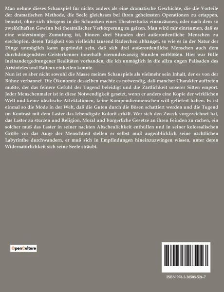 Man nehme dieses Schauspiel für nichts anders als eine dramatische Geschichte, die die Vorteile der dramatischen Methode, die Seele gleichsam bei ihren geheimsten Operationen zu ertappen, benutzt, ohne sich übrigens in die Schranken eines Theaterstücks einzuzäunen, oder nach dem so zweifelhaften Gewinn bei theatralischer Verkörperung zu geizen. Man wird mir einräumen, daß es eine widersinnige Zumutung ist, binnen drei Stunden drei außerordentliche Menschen zu erschöpfen, deren Tätigkeit von vielleicht tausend Räderchen abhänget, so wie es in der Natur der Dinge unmöglich kann gegründet sein, daß sich drei außerordentliche Menschen auch dem durchdringendsten Geisterkenner innerhalb vierundzwanzig Stunden entblößen. Hier war Fülle ineinandergedrungener Realitäten vorhanden, die ich unmöglich in die allzu engen Palisaden des Aristoteles und Batteux einkeilen konnte. Nun ist es aber nicht sowohl die Masse meines Schauspiels als vielmehr sein Inhalt, der es von der Bühne verbannet. Die Ökonomie desselben machte es notwendig, daß mancher Charakter auftreten mußte, der das feinere Gefühl der Tugend beleidigt und die Zärtlichkeit unserer Sitten empört. Jeder Menschenmaler ist in diese Notwendigkeit gesetzt, wenn er anders eine Kopie der wirklichen Welt und keine idealische Affektationen, keine Kompendienmenschen will geliefert haben. Es ist einmal so die Mode in der Welt, daß die Guten durch die Bösen schattiert werden und die Tugend im Kontrast mit dem Laster das lebendigste Kolorit erhält. Wer sich den Zweck vorgezeichnet hat, das Laster zu stürzen und Religion, Moral und bürgerliche Gesetze an ihren Feinden zu rächen, ein solcher muß das Laster in seiner nackten Abscheulichkeit enthüllen und in seiner kolossalischen Größe vor das Auge der Menschheit stellen er selbst muß augenblicklich seine nächtlichen Labyrinthe durchwandern, er muß sich in Empfindungen hineinzuzwingen wissen, unter deren Widernatürlichkeit sich seine Seele sträubt.
