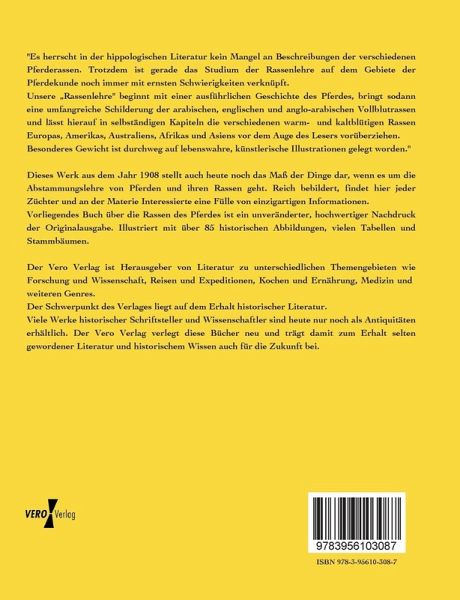 Vorliegendes Buch über die Rassen des Pferdes ist ein unveränderter, hochwertiger Nachdruck der Originalausgabe. Illustriert mit über 85 historischen Abbildungen, vielen Tabellen und Stammbäumen.