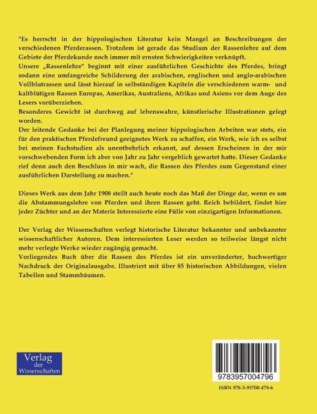 Vorliegendes Buch über die Rassen des Pferdes ist ein unveränderter, hochwertiger Nachdruck der Originalausgabe. Illustriert mit über 85 historischen Abbildungen, vielen Tabellen und Stammbäumen.