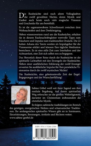 Die Rauhnächte sind nach altem Volksglauben die zwölf geweihten Nächte, deren Mystik und Zauber auch heute noch viele magische Visionen und Geschenke für uns bereithält.Es ist die sagenumwobene Schwellenzeit zwischen dem Weihnachtsfest und dem Dreikönigstag.Neben Wissenswertem rund um die Rauhnächte erhalten Sie in diesem Rauhnachtsbegleiter wertvolle Tipps zum Räuchern und Impulse zum traditionellen Orakeln. Die 22 hohen Arkana des Tarots werden als Impulsgeber für die Visionsreise erklärt und können Ihre tägliche Meditation bereichern. Es ist eine stille Zeit zum Innehalten und der Achtsamkeit, eine Zeit sich selbst neu zu begegnen.Das Herzstück dieser Reise durch die Rauhnächte ist die spirituelle Lichtarbeit mit den Erzengeln der Rauhnächte. Neben einer ausführlichen Erklärung der zwölf Erzengel erwarten Sie ausführliche Impulse für Ihre persönliche Visionsreise durch die zwölf mystischen Nächte!Die Rauhnächte, eine geheimnisvolle Zeit der Engel-Begegnungen und der Wunscherfüllung!