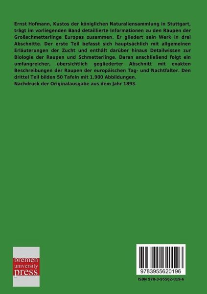 Ernst Hofmann, Kustos der königlichen Naturaliensammlung in Stuttgart, trägt im vorliegenden Band detaillierte Informationen zu den Raupen der Großschmetterlinge Europas zusammen. Er gliedert sein Werk in drei Abschnitte. Der erste Teil befasst sich hauptsächlich mit allgemeinen Erläuterungen der Zucht und enthält darüber hinaus Detailwissen zur Biologie der Raupen und Schmetterlinge. Daran anschließend folgt ein umfangreicher, übersichtlich gegliederter Abschnitt mit exakten Beschreibungen der Raupen der europäischen Tag- und Nachtfalter. Den drittel Teil bilden 50 Tafeln mit 1.900 Abbildungen.