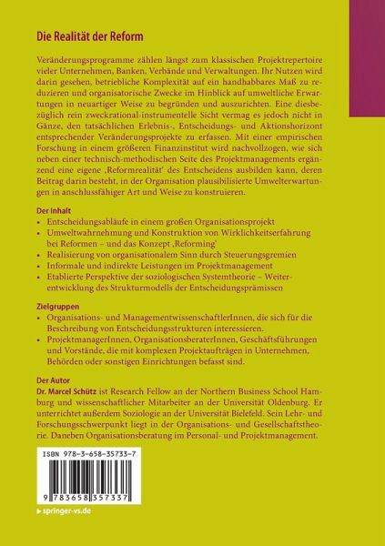Veränderungsprogramme zählen längst zum klassischen Projektrepertoire vieler Unternehmen, Banken, Verbände und Verwaltungen. Ihr Nutzen wird darin gesehen, betriebliche Komplexität auf ein handhabbares Maß zu reduzieren und organisatorische Zwecke im Hinblick auf umweltliche Erwartungen in neuartiger Weise zu begründen und auszurichten. Eine diesbezüglich rein zweckrational-instrumentelle Sicht vermag es jedoch nicht in Gänze, den tatsächlichen Erlebnis-, Entscheidungs- und Aktionshorizont entsprechender Veränderungsprojekte zu erfassen. Mit einer empirischen Forschung in einem größeren Finanzinstitut wird nachvollzogen, wie sich neben einer technisch-methodischen Seite des Projektmanagements ergänzend eine eigene ,Reformrealität' des Entscheidens ausbilden kann, deren Beitrag darin besteht, in der Organisation plausibilisierte Umwelterwartungen in anschlussfähiger Art und Weise zu konstruieren.