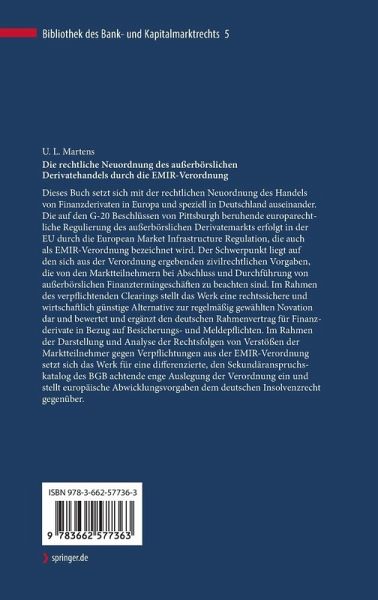 Dieses Buch setzt sich mit der rechtlichen Neuordnung des Handels von Finanzderivaten in Europa und speziell in Deutschland auseinander. Die auf den G-20 Beschlüssen von Pittsburgh beruhende europarechtliche Regulierung des außerbörslichen Derivatemarkts erfolgt in der EU durch die European Market Infrastructure Regulation, die auch als EMIR-Verordnung bezeichnet wird. Der Schwerpunkt liegt auf den sich aus der Verordnung ergebenden zivilrechtlichen Vorgaben, die von den Marktteilnehmern bei Abschluss und Durchführung von außerbörslichen Finanztermingeschäften zu beachten sind. Im Rahmen des verpflichtenden Clearings stellt das Werk eine rechtssichere und wirtschaftlich günstige Alternative zur regelmäßig gewählten Novation dar und bewertet und ergänzt den deutschen Rahmenvertrag für Finanzderivate in Bezug auf Besicherungs- und Meldepflichten. Im Rahmen der Darstellung und Analyse der Rechtsfolgen von Verstößen der Marktteilnehmer gegen Verpflichtungen aus der EMIR-Verordnung setzt sich das Werk für eine differenzierte, den Sekundäranspruchskatalog des BGB achtende enge Auslegung der Verordnung ein und stellt europäische Abwicklungsvorgaben dem deutschen Insolvenzrecht gegenüber.